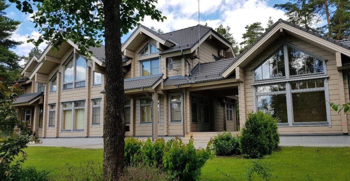 Коттедж выполнен из клееного бруса.